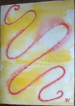 Daher spielt auch der Hintergrund, den du in Aquarellfarben ausführst, eine sehr, sehr wichtige Rolle. Jedes kleinste, rein „zufällig“ entstandene Detail (wie z.B. ein Farbverlauf) enthält Information, die mit dem Symbol-Kürzel in Kommunikation und Interaktion tritt!