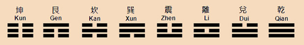 Die acht Trigramme werden in zwei Gruppen unterteilt, in die so genannte Ost-Gruppe und in die West-Gruppe. Diese Namen haben etwas mit den Himmelsrichtungen zu tun, die mit diesen Trigrammen zusammenhängen.