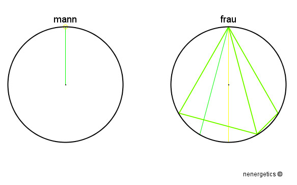 Das Bild ist komplexer. Was sofort auffällt, ist die vertikale Achse. Sie ist quasi die Verlängerung des Mannes. Gleichzeitig auch eine Art Öffnung. Alle Linien gehen vom höchsten Punkt aus, d.h. alle orientieren sich gewissermassen am spirituellen Aspekt vom Mann. Die innere Achse ist die einzige Linie, die sie mit dem Mann teilt. Und es ist eine Linie, die die Linie des Mannes weiter führt. Sie geht sozusagen über ihn hinaus, braucht ihn aber als wesentlichen Impuls für die Manifestierung ihrer weiblichen Qualität.